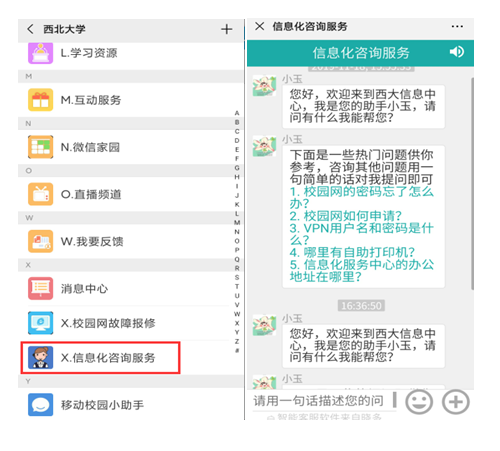 第二步:在“乐鱼网页版页面登录”微信企业号中点击“X.信息化咨询服务”,信息化智能客服小玉将为您解答信息化服务问题。
