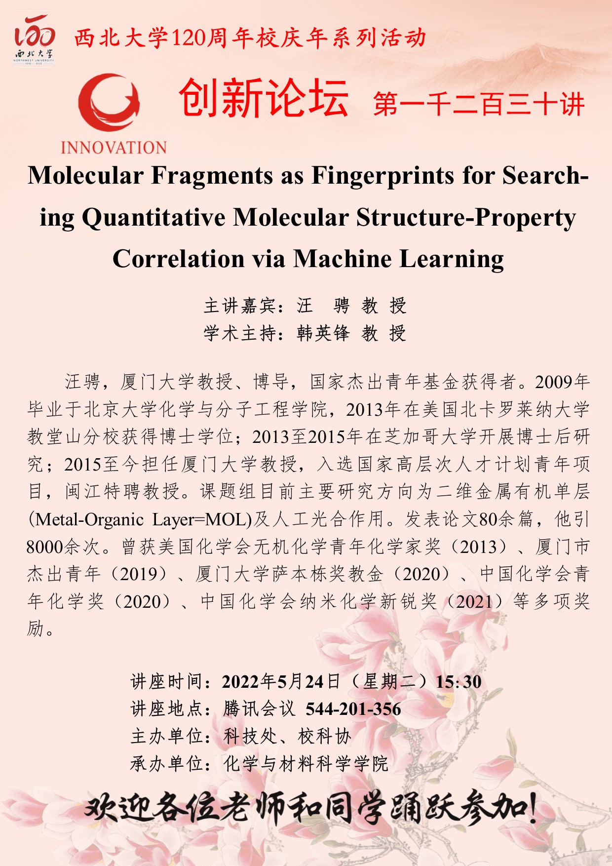 乐鱼网页版页面登录创新论坛第一千二百三十讲暨120周年校庆年系列活动:Molecular Fragments as Fingerprints for Searching Quantitative Molecular Structure-Property Correlation via Machine Learning 作者:汪骋 教授 编辑: 时间:2022-05-23
