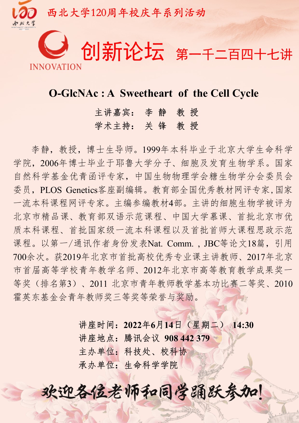 乐鱼网页版页面登录创新论坛第一千二百四十七讲暨120周年校庆年系列活动:O-GlcNAc : A Sweetheart of the Cell Cycle 作者:李 静 教 授 编辑: 时间:2022-06-13