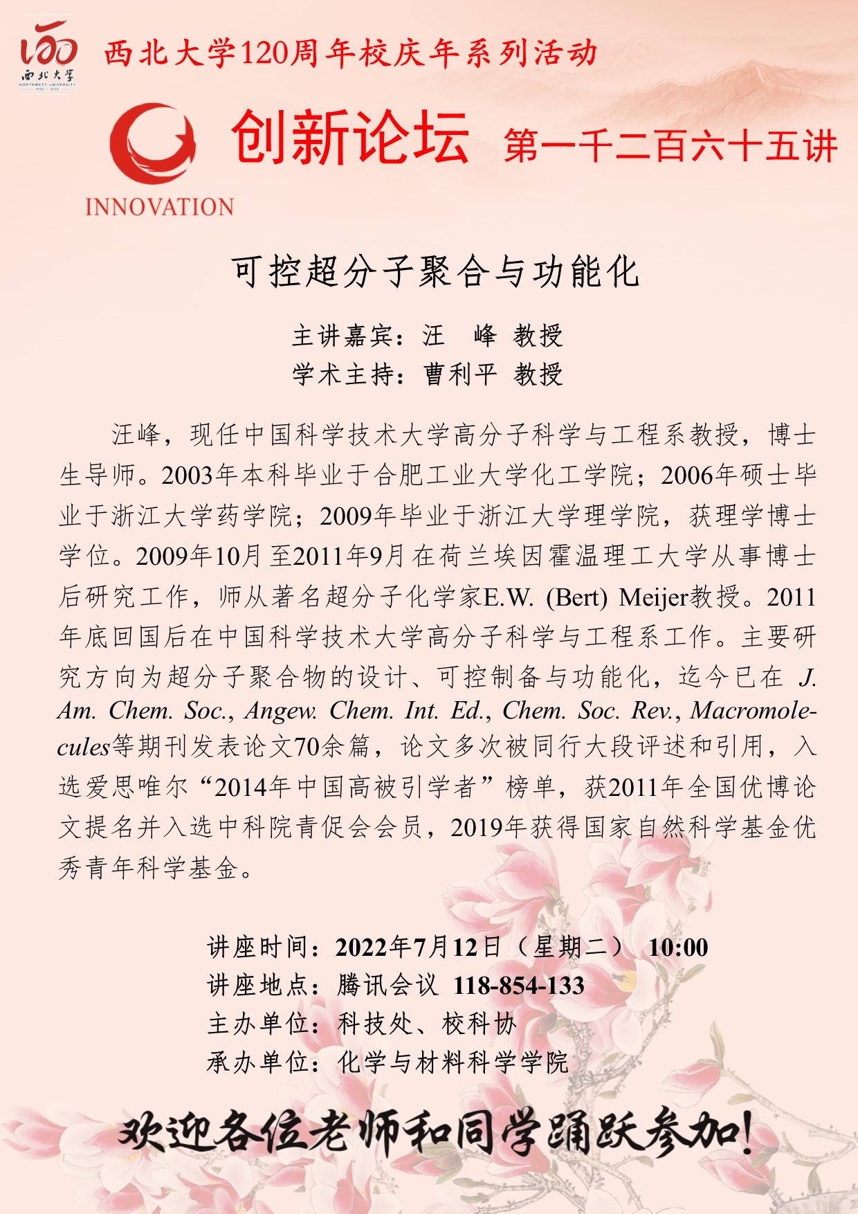 乐鱼网页版页面登录创新论坛第一千二百六十五讲暨120周年校庆年系列活动:可控超分子聚合与功能化