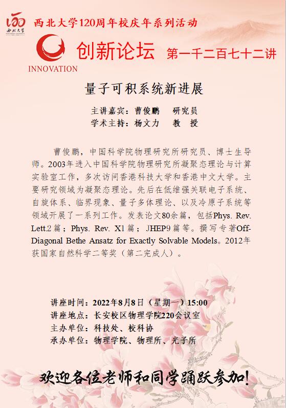 乐鱼网页版页面登录创新论坛第一千二百七十二讲暨120周年校庆年系列活动:量子可积系统新进展