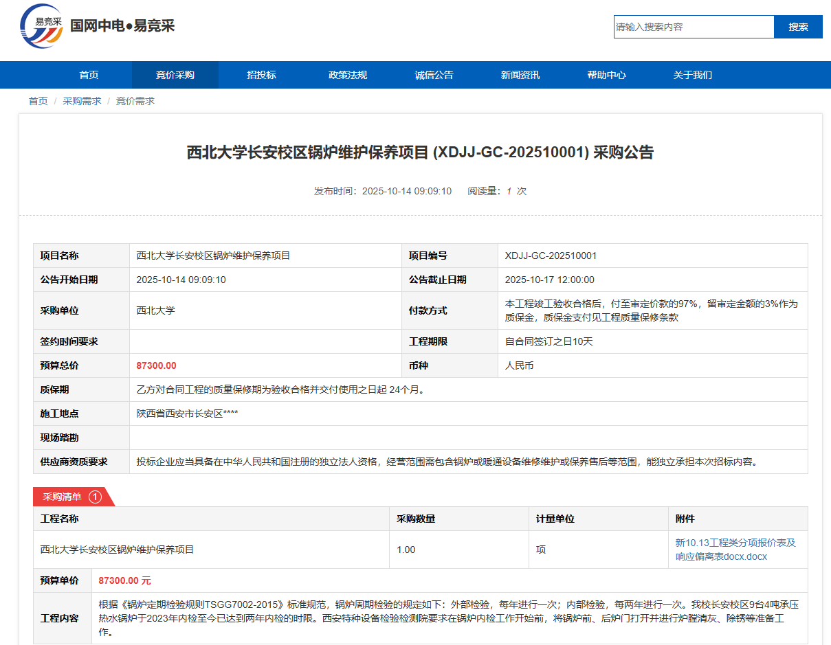 乐鱼网页版页面登录长安校区锅炉维护保养项目(XDJJ-GC-202510001)竞价采购公告