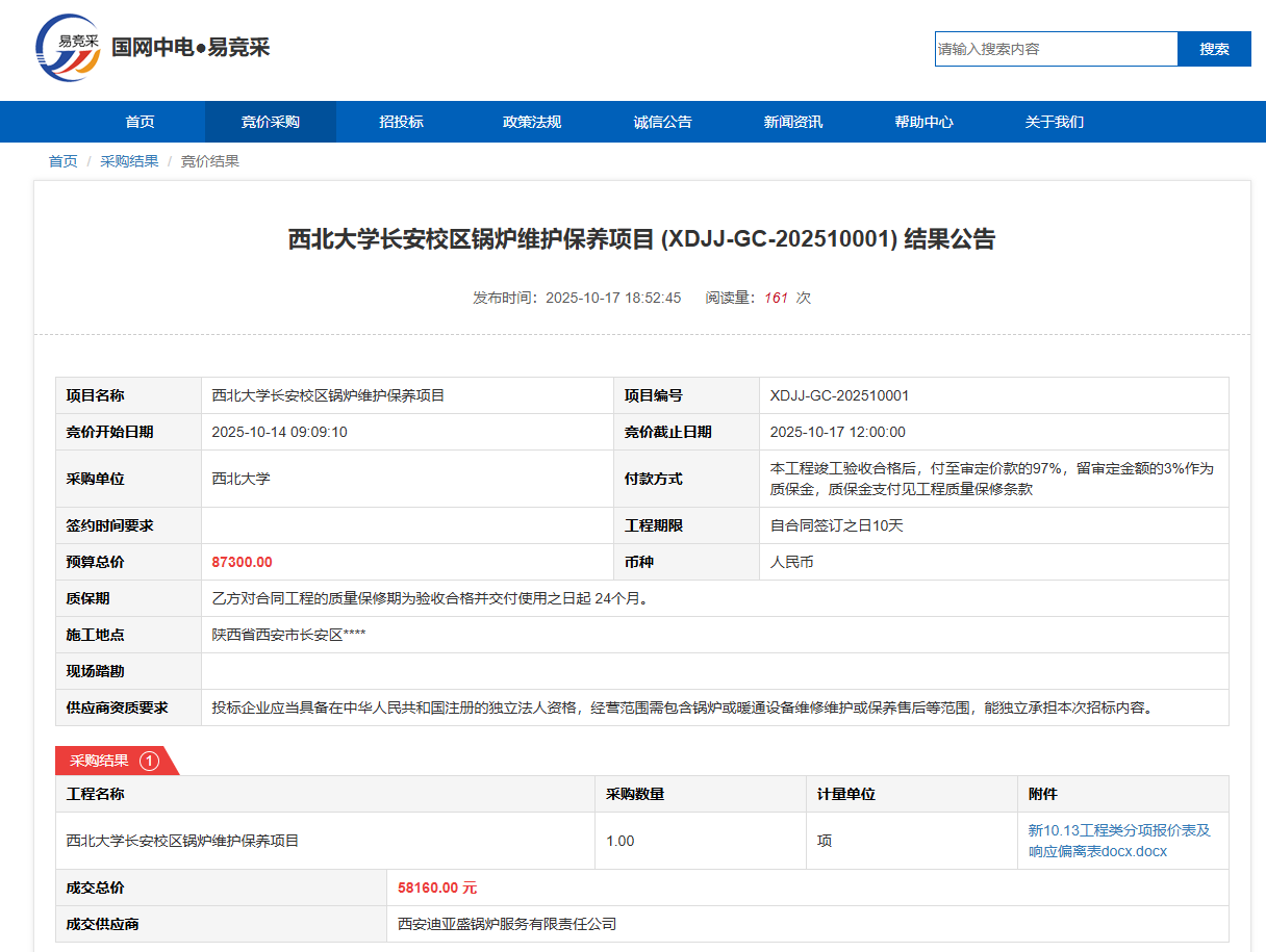 乐鱼网页版页面登录长安校区锅炉维护保养项目(XDJJ-GC-202510001)竞价结果公告