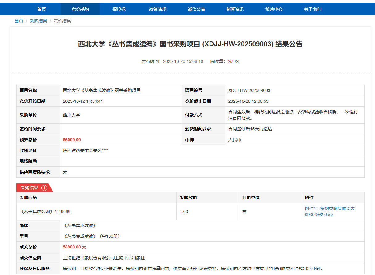 乐鱼网页版页面登录《丛书集成续编》图书采购项目(XDJJ-HW-202509003)竞价结果公告