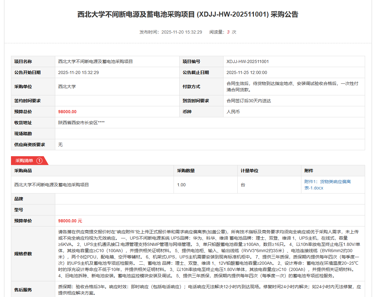 乐鱼网页版页面登录不间断电源及蓄电池采购项目(XDJJ-HW-202511001)竞价采购公告