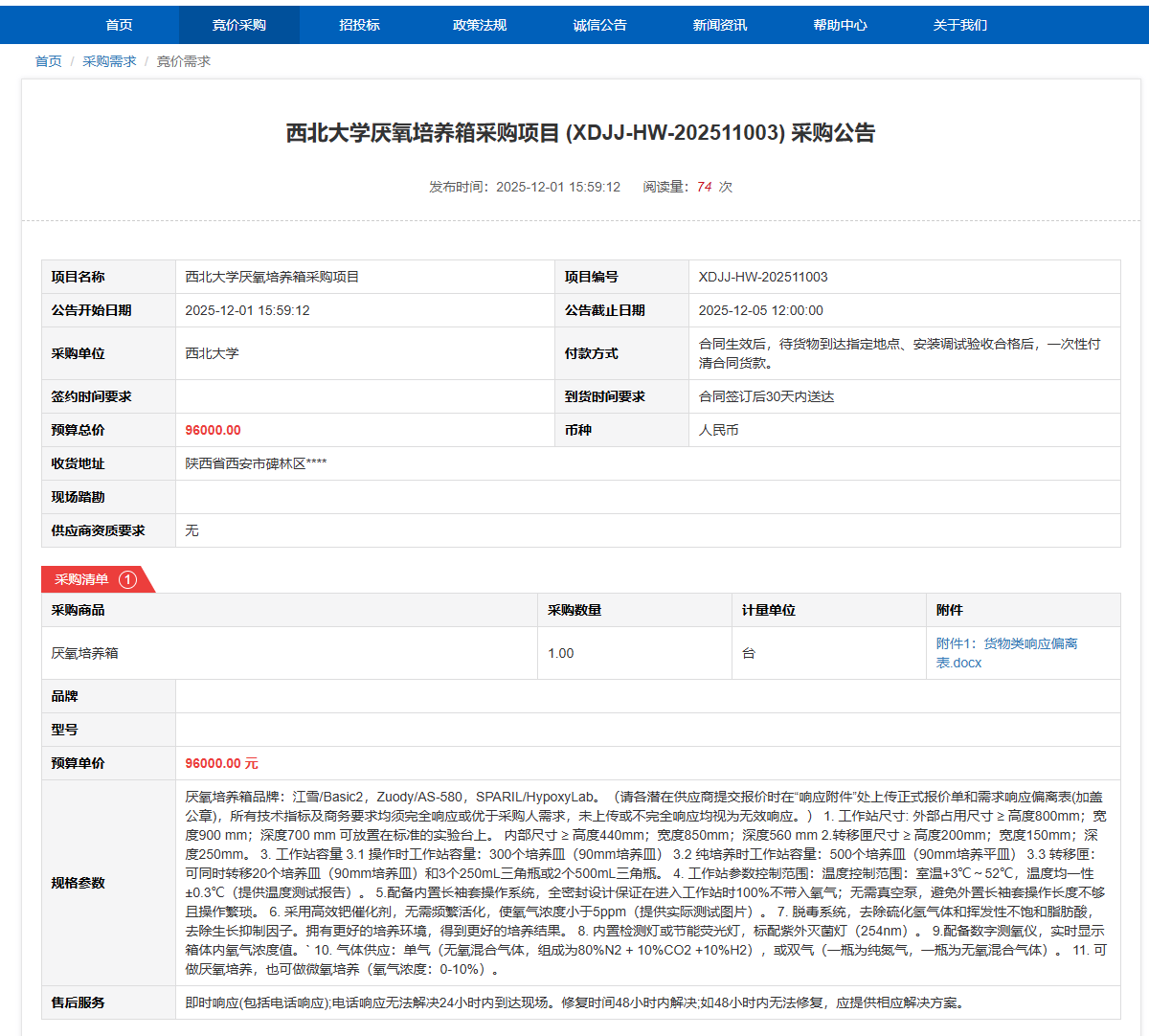 乐鱼网页版页面登录厌氧培养箱采购项目(XDJJ-HW-202511003)竞价采购公告