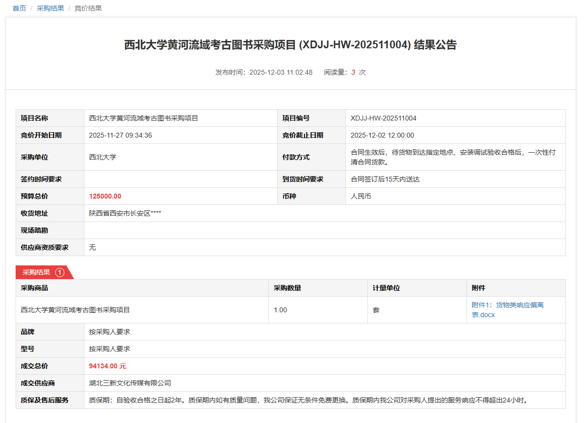 乐鱼网页版页面登录黄河流域考古图书采购项目(XDJJ-HW-202511004)竞价结果公告