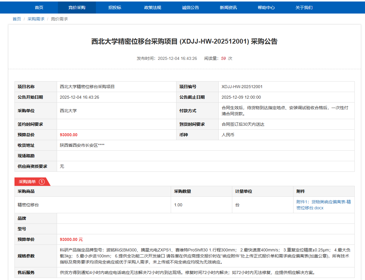 乐鱼网页版页面登录精密位移台采购项目(XDJJ-HW-202512001)竞价采购公告