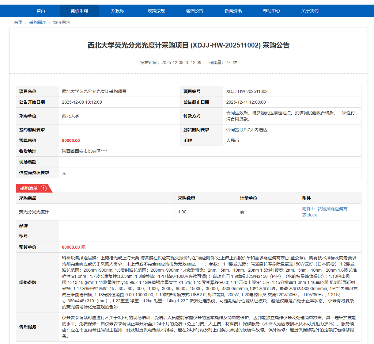 乐鱼网页版页面登录荧光分光光度计采购项目(XDJJ-HW-202511002)竞价采购公告