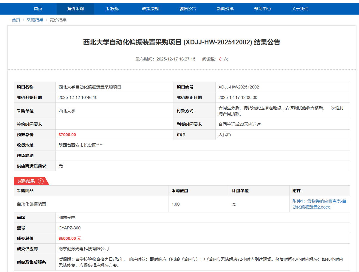 乐鱼网页版页面登录自动化偏振装置采购项目(XDJJ-HW-202512002)竞价结果公告