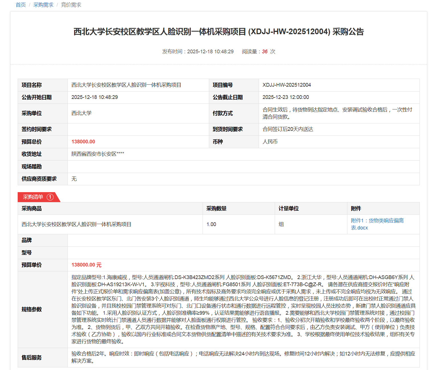 乐鱼网页版页面登录长安校区教学区人脸识别一体机采购项目(XDJJ-HW-202512004)竞价采购公告