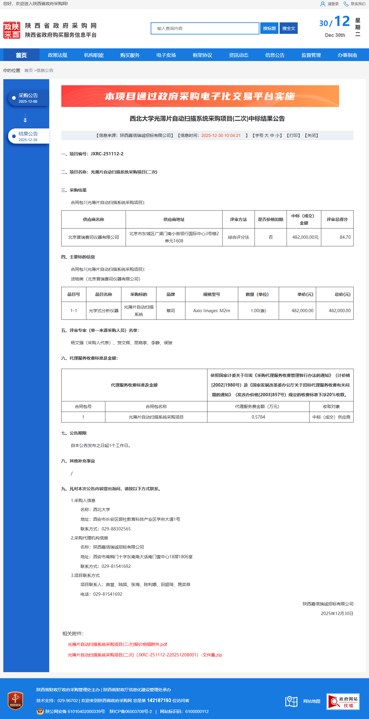 乐鱼网页版页面登录光薄片自动扫描系统采购项目(二次)中标结果公告