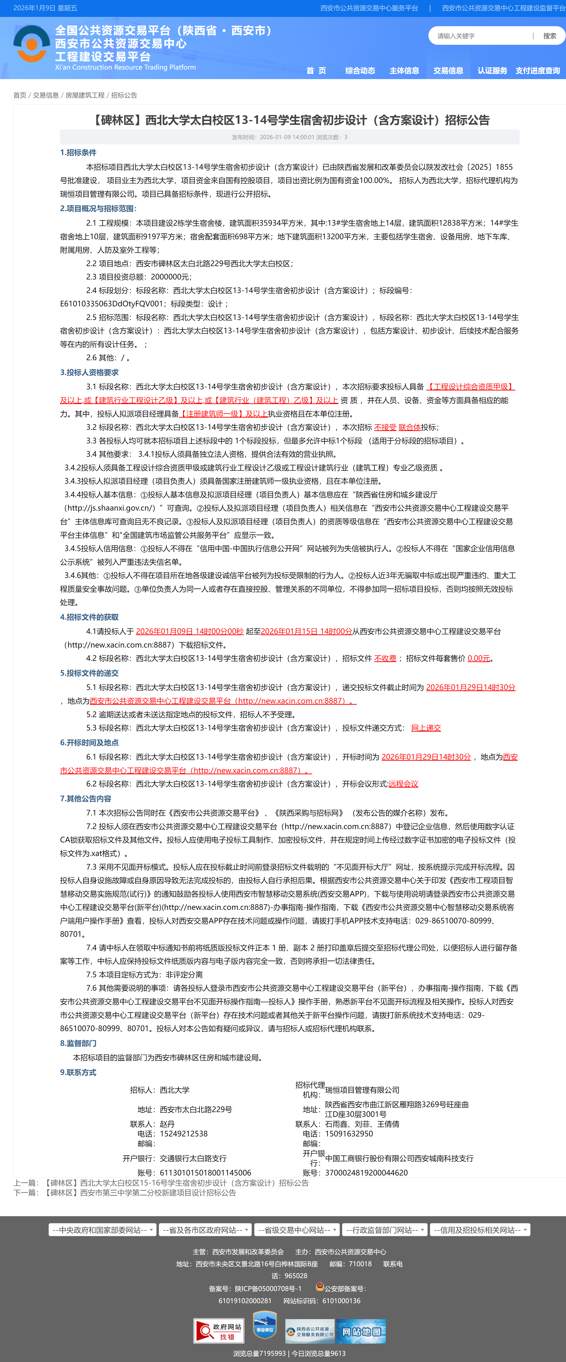 【碑林区】乐鱼网页版页面登录太白校区13-14号学生宿舍初步设计(含方案设计)招标公告
