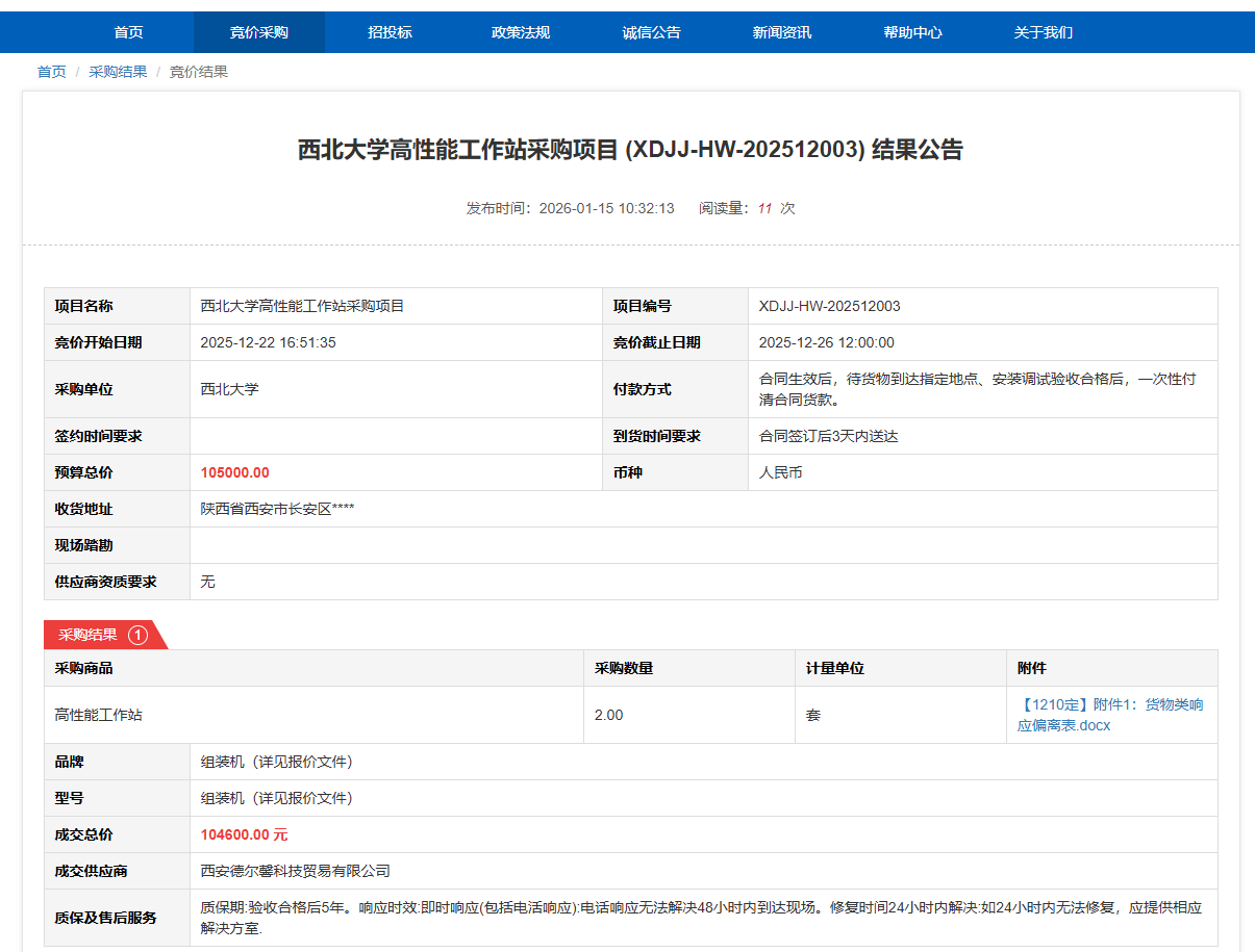 乐鱼网页版页面登录高性能工作站采购项目(XDJJ-HW-202512003)竞价结果公告